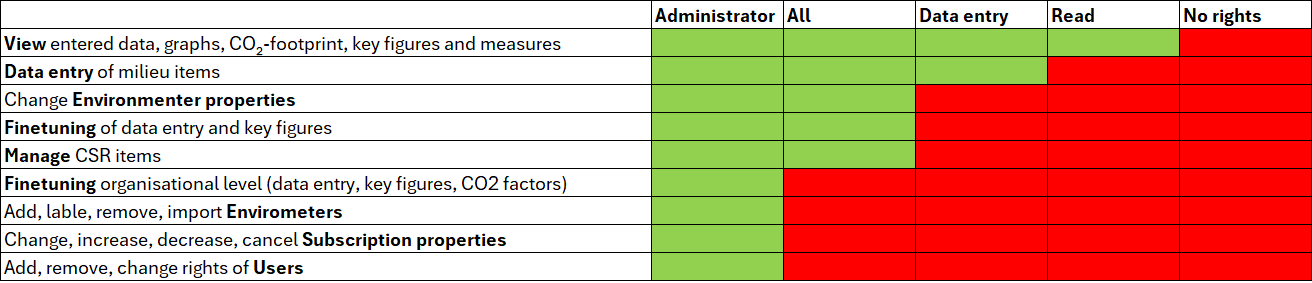 An administrator of an Envirometer subscription can give others access to the subscription. The number of users and co-administrators is unlimited and you can define the rights for each user. This may be useful, for example, to enable colleagues to enter data for their location and to give ‘read-only’ access to other locations.